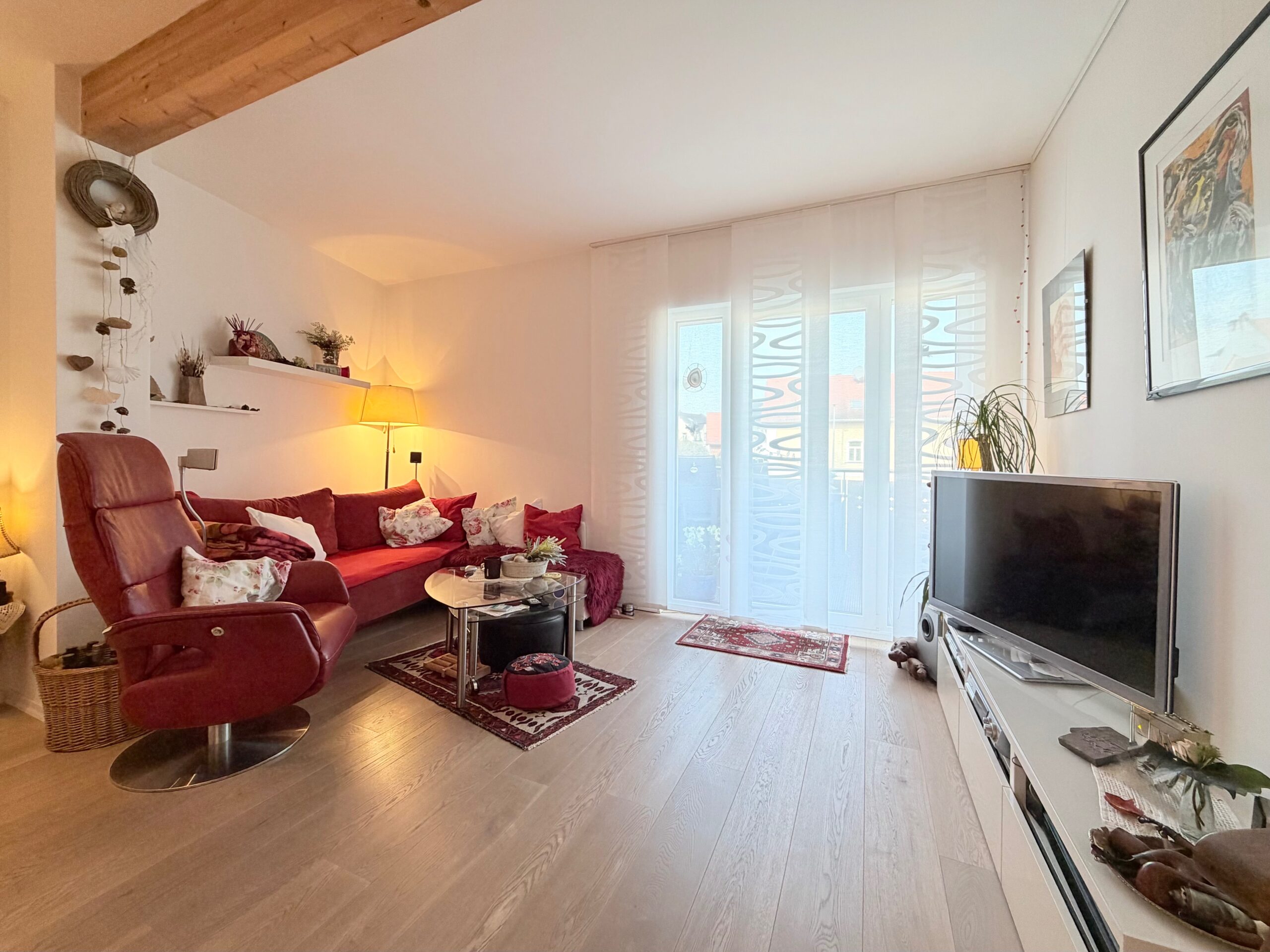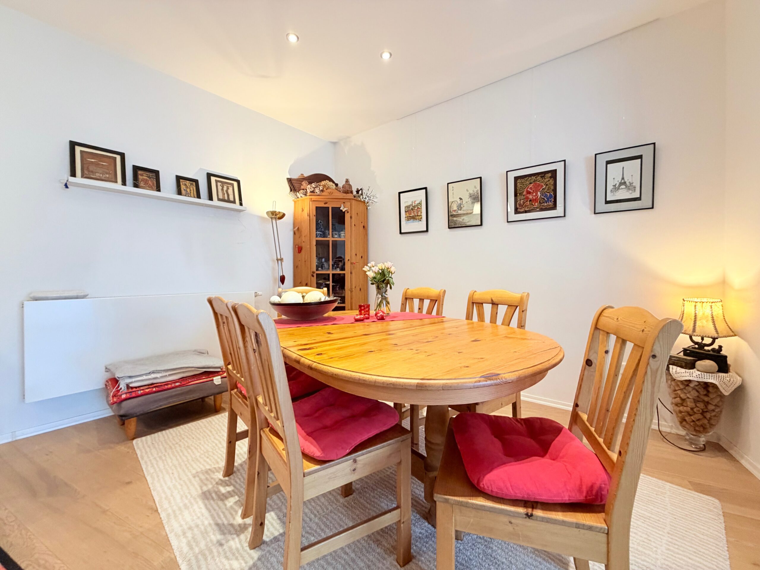 Die Wohnetage im Obergeschoss bildet den zentralen Lebensmittelpunkt des Hauses. Sie umfasst drei Zimmer, darunter ein großzügiges Wohn-, Ess- und Küchenensemble mit direktem Zugang zum Balkon. Ergänzt wird die Etage durch ein großes Zimmer mit Blick in den Innenhof sowie ein Schlafzimmer. Das Tageslichtbad ist mit bodentiefer Dusche, Badewanne und Handtuchheizkörper ausgestattet. Ein weiteres, innenliegendes Badezimmer verfügt über eine Dusche sowie einen Waschmaschinenanschluss.