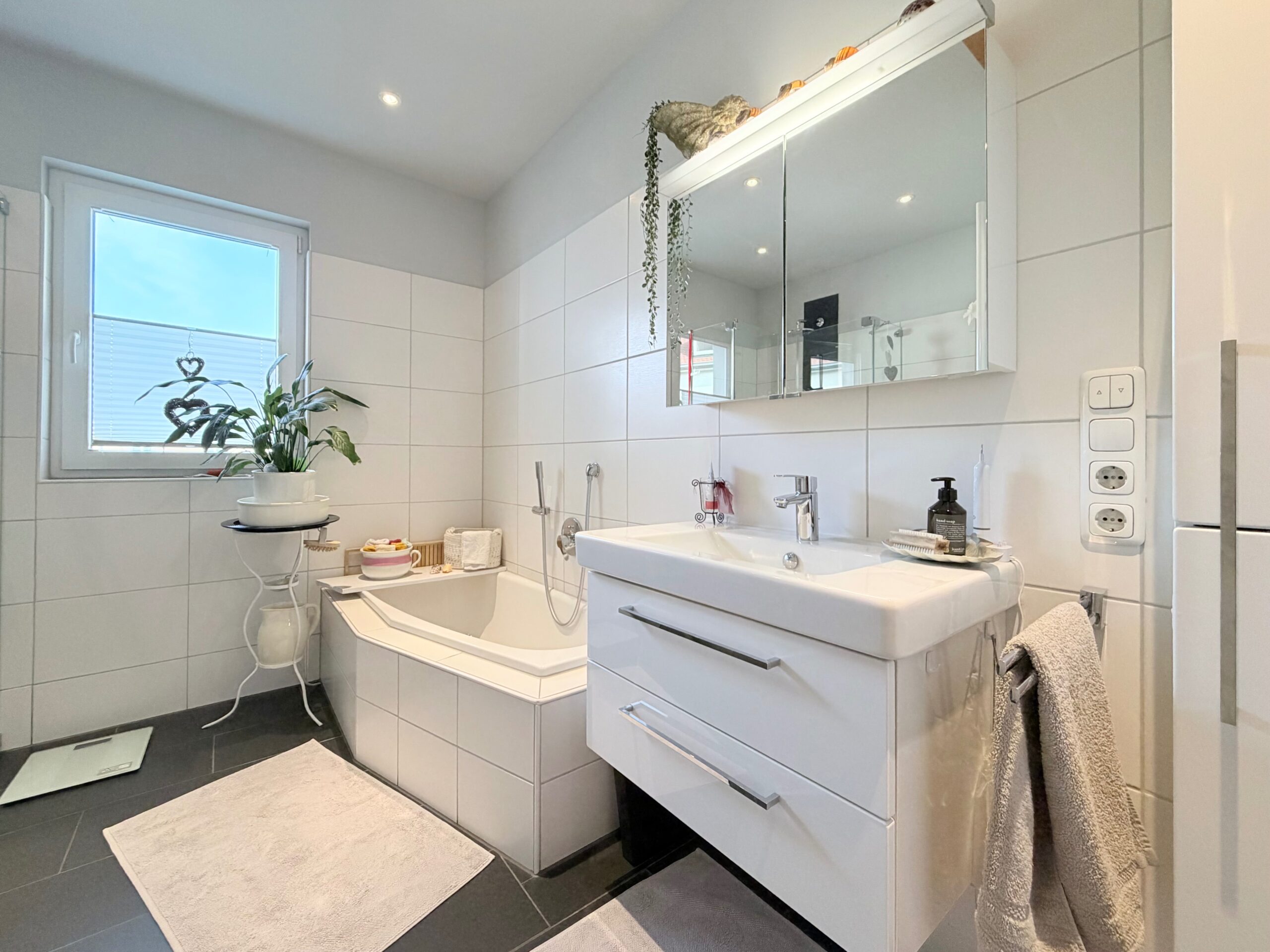 - Badausstattung: Dusche, Badewanne, Fenster
