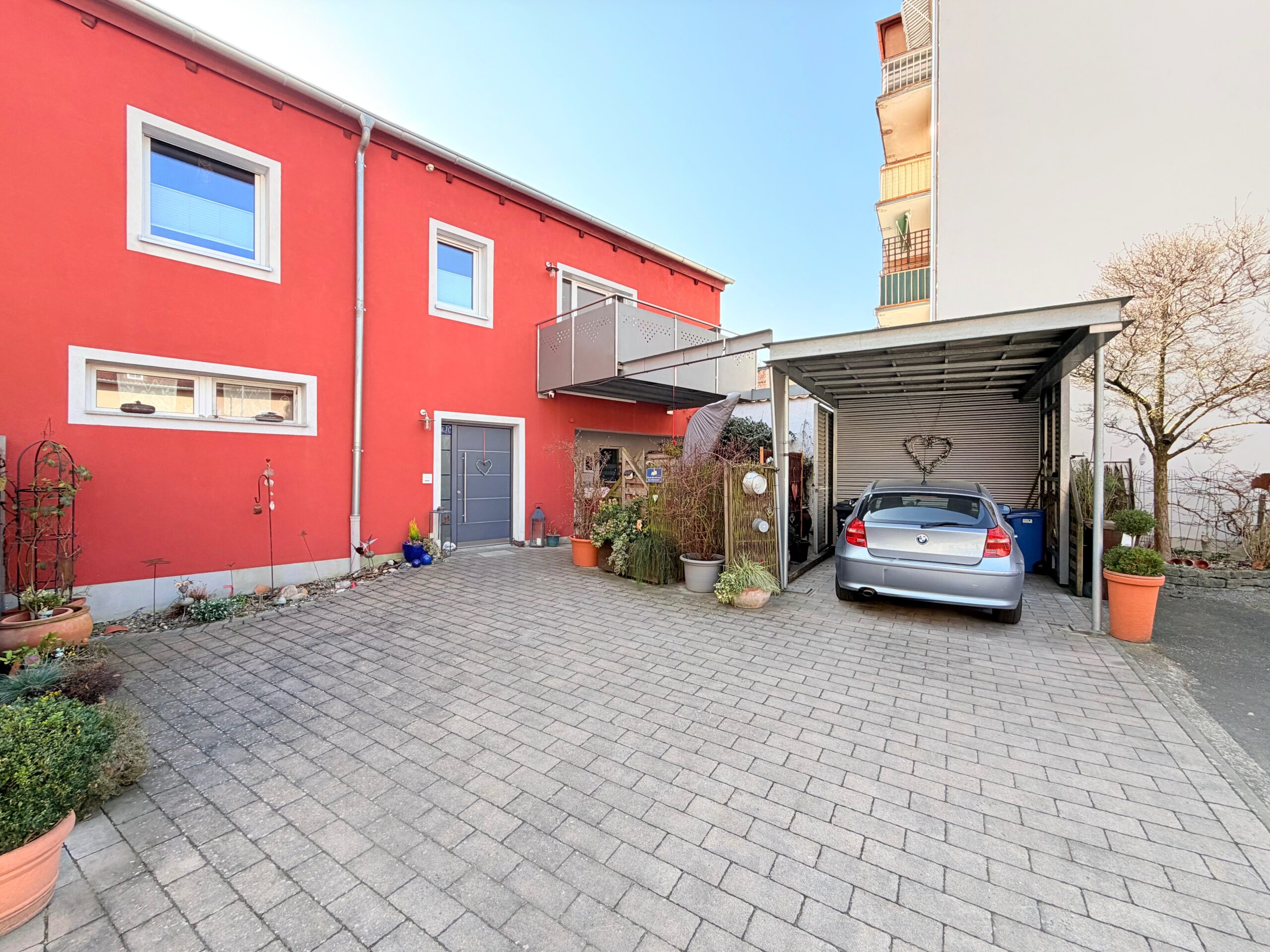 Der Außenbereich umfasst ein Garagen-Carport mit integriertem Nebenraum, eine Außen- bzw. Sitzfläche sowie zusätzliche Hofflächen mit weiteren Parkmöglichkeiten.